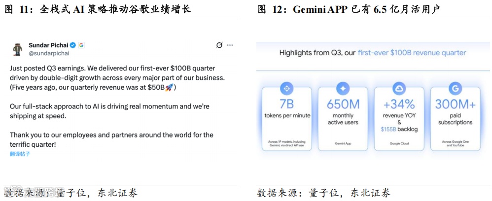 海外AI商业化闭环初步形成,AI赋能作用明显。以谷歌为例,在AI业务带动之下,谷歌2025三季度营收首次突破千亿美元,谷歌CEO表示全栈式AI策略推动了这一增长。谷歌AI业务已进入实质商业化阶段,形成了明确产品线和用户规模。Gemini大模型已通过API开放给开发者及企业客户,官方披露Gemini模型每分钟处理Token数量已达70亿,反映调用密度和商用落地广度。Gemini App作为面向C端用户的AI助手,全球月活跃用户数已达6.5亿人。另外,在广告业务中,生成式AI已被用于素材生成、搜索广告推荐和视频广告生成,谷歌称AI已“正向影响广告系统的每一部分”。