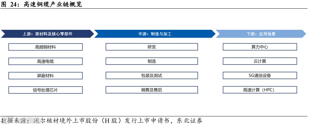 个完整且紧密相连的产业链体系。根据沃尔核材境外上市股份(H 股)发行上市申请书,高速通信电缆行业的上游板块主要涉及原材料及核心零部件的供应。中游板块主要集中在研发、制造及测试方面。在下游,高速通信电缆广泛应用于算力中心、云计算、高速计算(HPC)及5G 设备等领域。