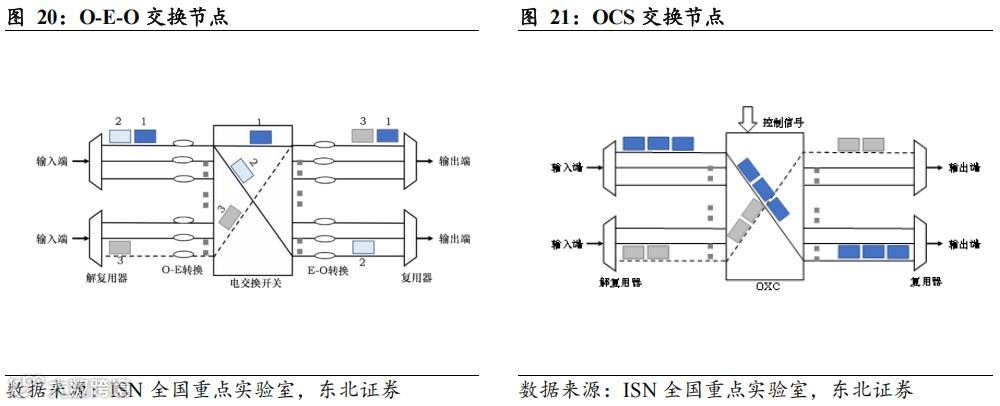 我们认为,基于电交换机与光交换机的不同特性,CPO与OCS有望在数据中心网络共存:传统电交换更适合流量动态变化大、需要频繁调整数据传输路径的场景;光交换技术更适合用在流量模式相对稳定、端口间映射关系明确且不用频繁切换的场景,避开切换时间长的短板。目前,OCS整体落地应用节奏领先于CPO。
