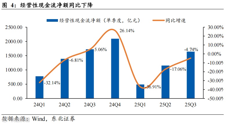 营收增速保持稳健,净利润水平高增。2025年前三季度,通信板块实现营业总收入1.95万亿元,同比增长3.22%。分季度来看,2025Q1-Q3分别实现营业收入6366.29/6854.36/6304.68亿元,同比增速分别为2.42%/3.54%/3.69%。净利润方面,近年来通信板块净利水平呈现明显的季节性,二季度利润较高,季度间利润水平波动较大; 25年前三季度净利润走势同样呈现明显季节性,第二季度利润达到高峰,前三季度分别同比增长6.69%/8.26%/11.68%,在AI基础设施建设稳步推进的情况下表现亮眼。经营性现金流方面,2025年前三季度经营活动产生的净现金流均同比下滑。分季度来看,2025Q1-Q3通信行业经营性净现金流同比降幅为-36.91%/-17.06%/-4.74%。