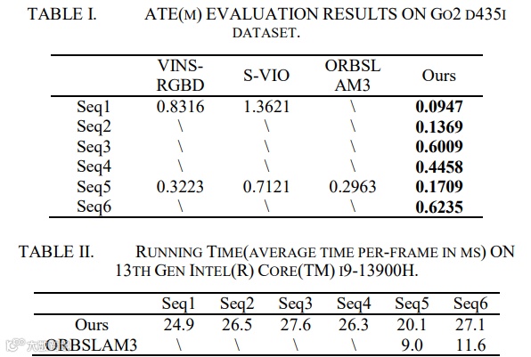 为进步验证位姿估计精度,我们在SubT-MRS数据集上使用自研里程计系统进行绝对轨迹误差分析。该数据集涵盖传感器退化、剧烈运动与极端天气等挑战性环境。数据集八个序列分为两组测试:几何退化(仅点云退化)与混合退化(点云与视觉同时退化)。对比系统的ATE结果取自公开SLAM挑战赛。参赛团队被允许使用闭环检测技术进行后处理精度提升。尽管如此,本方法仍以0.271的平均ATE(未使用闭环检测)超越次优方法54%(表III)。
