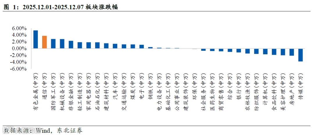 本周行情回顾:本 周(2025.12.01-2025.12.07)申万通信指数上涨3.69%,上证指数上涨0.37%,深证成指上涨1.26%,创业板指数上涨 1.86%,沪深300 指数上涨1.28%,通信板块在31 个申万一级行业中涨幅排名第二,表现强于大盘。本周通信三级子行业中,通信网络设备及器件涨幅最大 (5.67%),通信线缆及配套(3.53%)、通信终端及配件(3.03%)、其他通信设备(1.49%)、通信工程及服务(1.25%)均延续上周上涨态势。通信应用增值服务(-2.91%)跌幅最大。本周天孚通信(25.79%)、通宇通讯(23.93%)、实达集团(19.88%)涨幅分列前三,线上线下(-11.83%)、数据港(-10.82%)、恒信东方(-8.55%)跌幅分列前三。