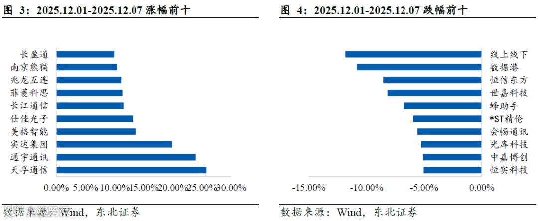 本周(2025.12.01-2025.12.07)天孚通信(25.79%)、通宇通讯(23.93%)、实达集团(19.88%)涨幅分列前三,线上线下(-11.83%)、数据港(-10.82%)、恒信东方(-8.55%)跌幅分列前三。