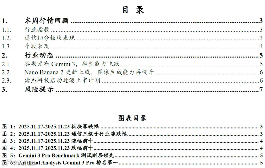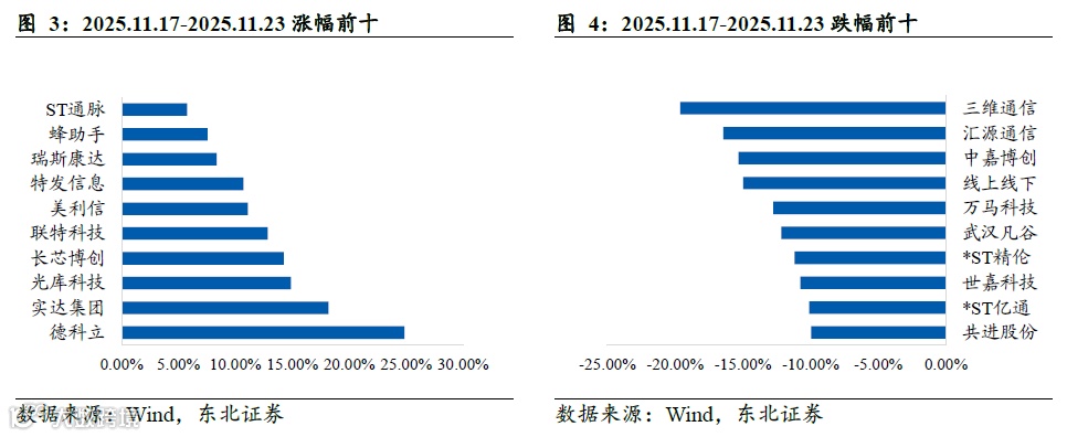 本周(2025.11.17-2025.11.23)德科立(24.82%)、实达集团(18.16%)、光库科技(14.86%)涨幅分列前三,三维通信(-19.61%)、汇源通信(-16.44%)、中嘉博创(-15.32%)跌幅分列前三。