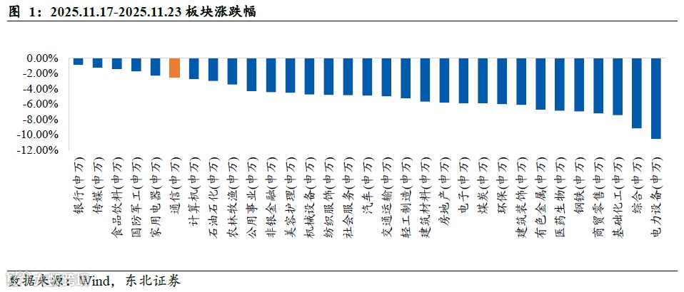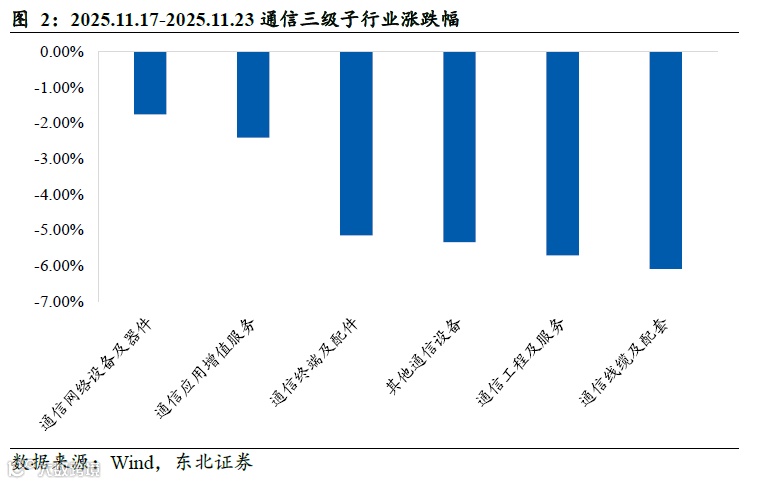 本周(2025.11.17-2025.11.23)通信三级子行业中,通信网络设备及器件跌幅最小 (-1.76%),通信线缆及配套跌幅最大 (-6.09%),本周各细分板块主要呈回调趋势。