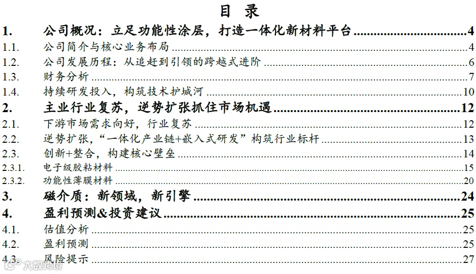 公司是国内新材料行业领跑者,功能性涂层复合材料生产的领军企业。主要从事业务为薄膜的功能化,专注研发、生产和销售功能性薄膜材料、电子级胶粘材料、热管理复合材料及薄膜包装材料等产品,广泛应用于消费电子、新能源汽车、新型显示、家用电器等领域。目前,公司是国内少数在高分子材料聚合、涂层配方优化、功能结构设计、产品精密涂布以及新技术产业化应用等方面具有领先优势的高新技术企业。