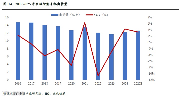 伴随着折叠屏、新能源汽车、AR/VR 眼镜等新应用场景的持续拓展,下游市场空间增长。根据IDC数据,自2024年起,全球智能手机市场步入复苏通道。据机构数据显示,2024年全球智能手机出货量约12.2亿部,同比增长7%,结束连续两年下滑态势;2025年预计出货量将进一步增至12.4亿部,增速约1%,市场进入温和增长阶段。与此同时,中国国内市场也实现触底反弹,2024年全年智能手机出货量约2.86亿台,同比增长5.6%,主要受益于过去几年被压抑的换机需求集中释放,以及全国性消费补贴政策的推动。