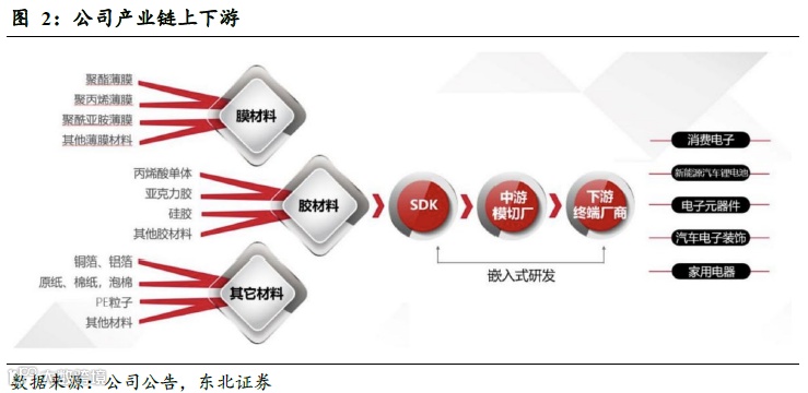 下游:在市场拓展与客户合作方面,公司采用独特的“嵌入式研发”模式,与下游消费电子和汽车电子领域的品牌终端客户建立了直接且紧密的联系。公司根据终端客户对产品性能的具体要求进行针对性开发,待产品通过认证后,由终端客户指定其合作的模切厂向公司进行采购。这种深度绑定的合作模式不仅增强了客户黏性,也为公司持续的技术创新和产品升级提供了动力。