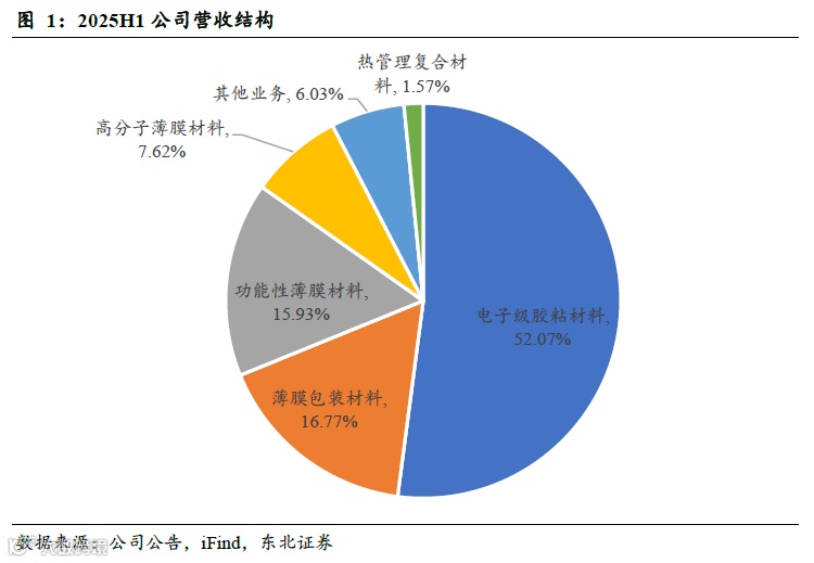 公司产品矩阵多元覆盖,电子级胶粘料占据核心。公司的主营业务收入结构清晰,主要由五大核心产品矩阵构成:电子级胶粘材料、功能性薄膜材料、薄膜包装材料、高分子薄膜材料以及热管理复合材料。其中,电子级胶粘材料是公司绝对的营收基石,根据数据显示,其在2024年的主营业务收入中占比高达52.95%;功能性薄膜材料与薄膜包装材料亦是重要的收入来源,合计贡献了36.71%的收入份额。
