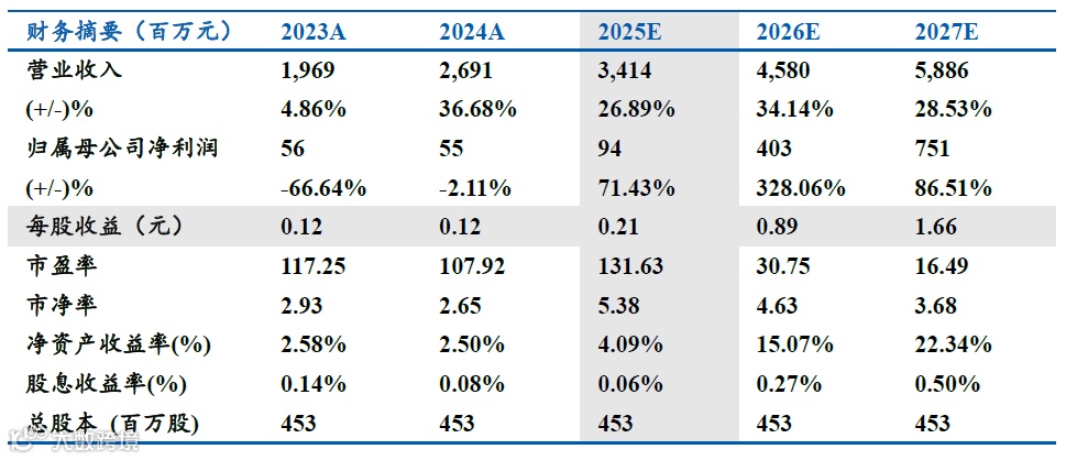 预计2025-2027年公司归母净利润分别为0.94/ 4.03/ 7.51亿元,同比增长分别为+71.43%/ +328.06%/ +86.51%,对应PE 分别为132x/ 31x/ 16x,首次覆盖,给予“买入”评级。