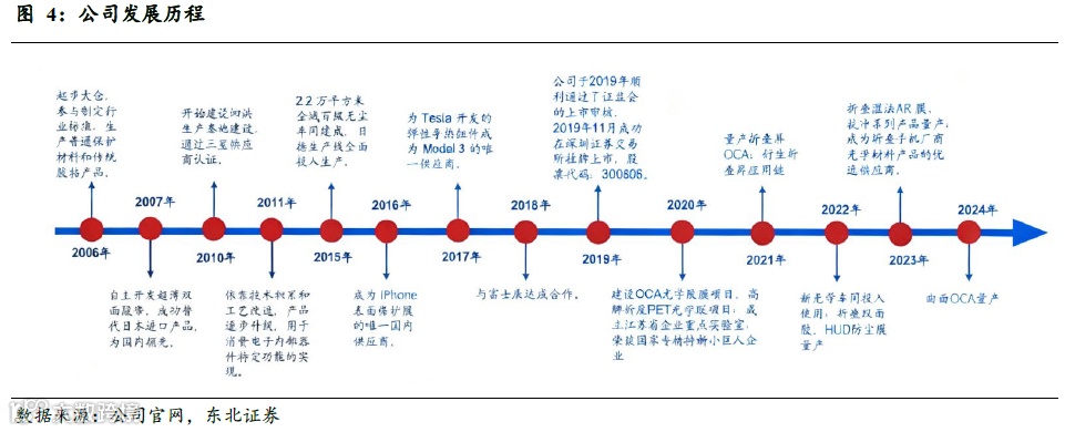 2020年:向产业链上游扩展业务,投资建设高解析度PET光学膜项目、OCA光学胶膜项目等多个重大项目;与华为开展深度合作,成为特斯拉自制电池膜材料解决方案综合供应商。