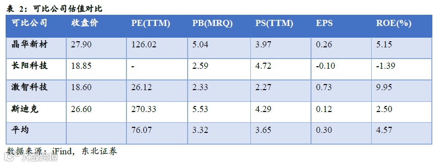 估值方面,相比业内其他企业,更具上升空间。通过对比行业内其他几个主要企业,包括晶华新材、长阳科技、激智科技等,我们认为斯迪克应给予更高的估值。主要原因有几点:1)公司近几年逆势扩张,解决卡脖子材料进口替代,形成胶膜协同差异化竞争优势。2)前期大规模投入导致的短期财务阵痛已过,业绩拐点已现。3)公司专注技术研发,高端产品以逐步实现国产替代,份额持续提升。4)公司联合大厂客户进行先进技术研发。因此,我们认为相较业内其他企业,斯迪克更具备想象空间,应给予更高的估值。
