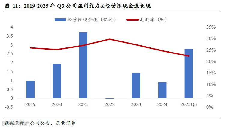 公司毛利保持稳健,现金流明显改善。尽管近年净利润承压,但公司的核心盈利能力和经营健康度依然稳固。数据显示,公司的毛利率维持在22.3%的较高水平,表明其主营业务的定价能力和成本控制能力并未削弱。尽管大规模资本开支对公司整体现金流造成了阶段性压力,但其经营性现金流持续表现强劲,显示出核心业务稳固的“造血”能力。
