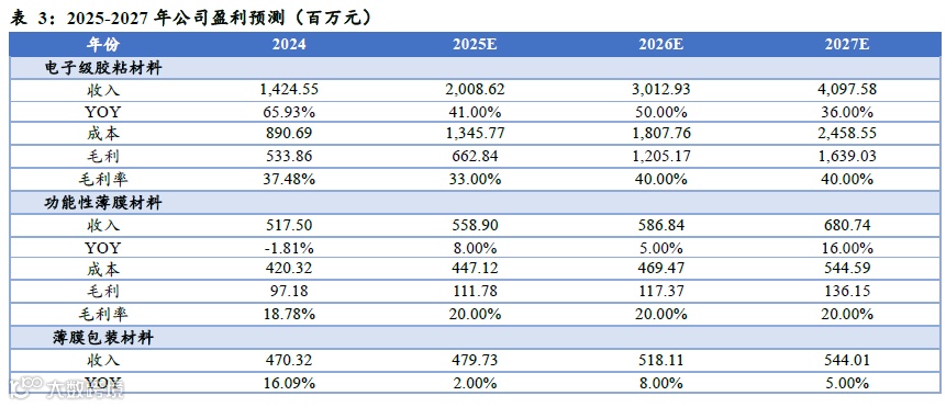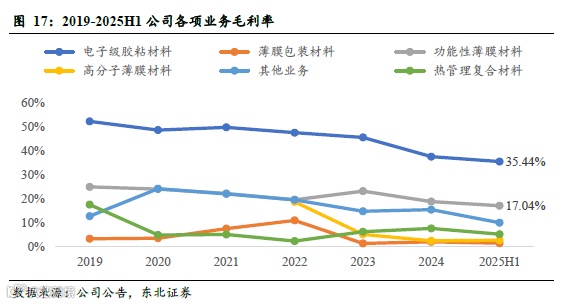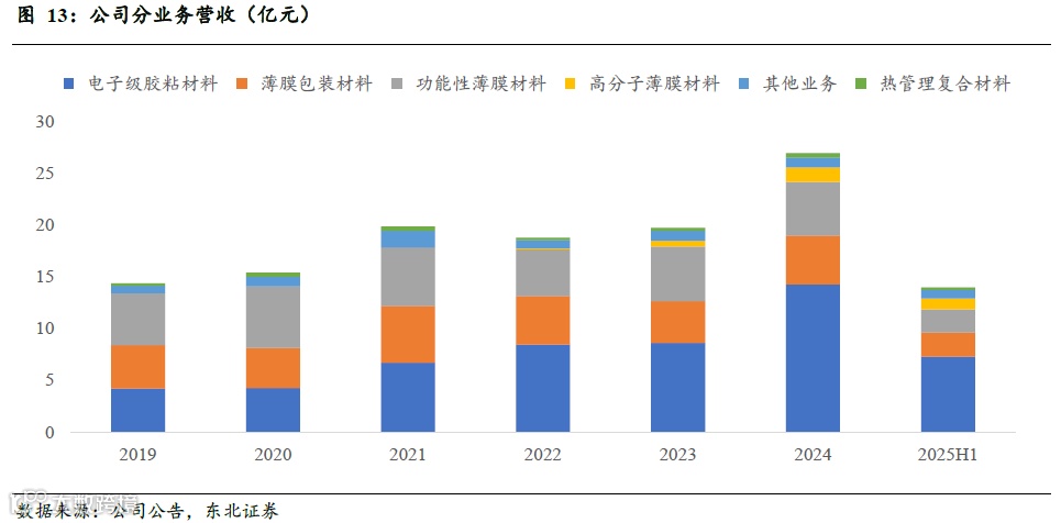 公司近年专注于电子级胶粘材料与功能性薄膜材料两大业务板块,已具备核心竞争力。2024年,电子级胶粘材料与功能性薄膜材料两大产品合计贡献公司总营收的72.18%,其中电子级胶粘材料占比52.95%,功能性薄膜材料占比19.23%。另外,电子级胶粘材料与功能性薄膜材料两项业务毛利率分别为37.48%/ 18.78%,显著高于其他业务,共同构成驱动公司业绩增长的核心引擎。