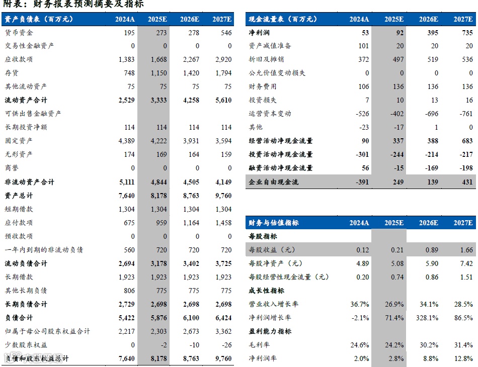 盈利预测&投资建议:预计2025-2027年公司归母净利润分别为0.94/ 4.03/ 7.51亿元,同比增长分别为+71.43%/ +328.06%/ +86.51%,对应PE 分别为132x/ 31x/ 16x,首次覆盖,给予“买入”评级。