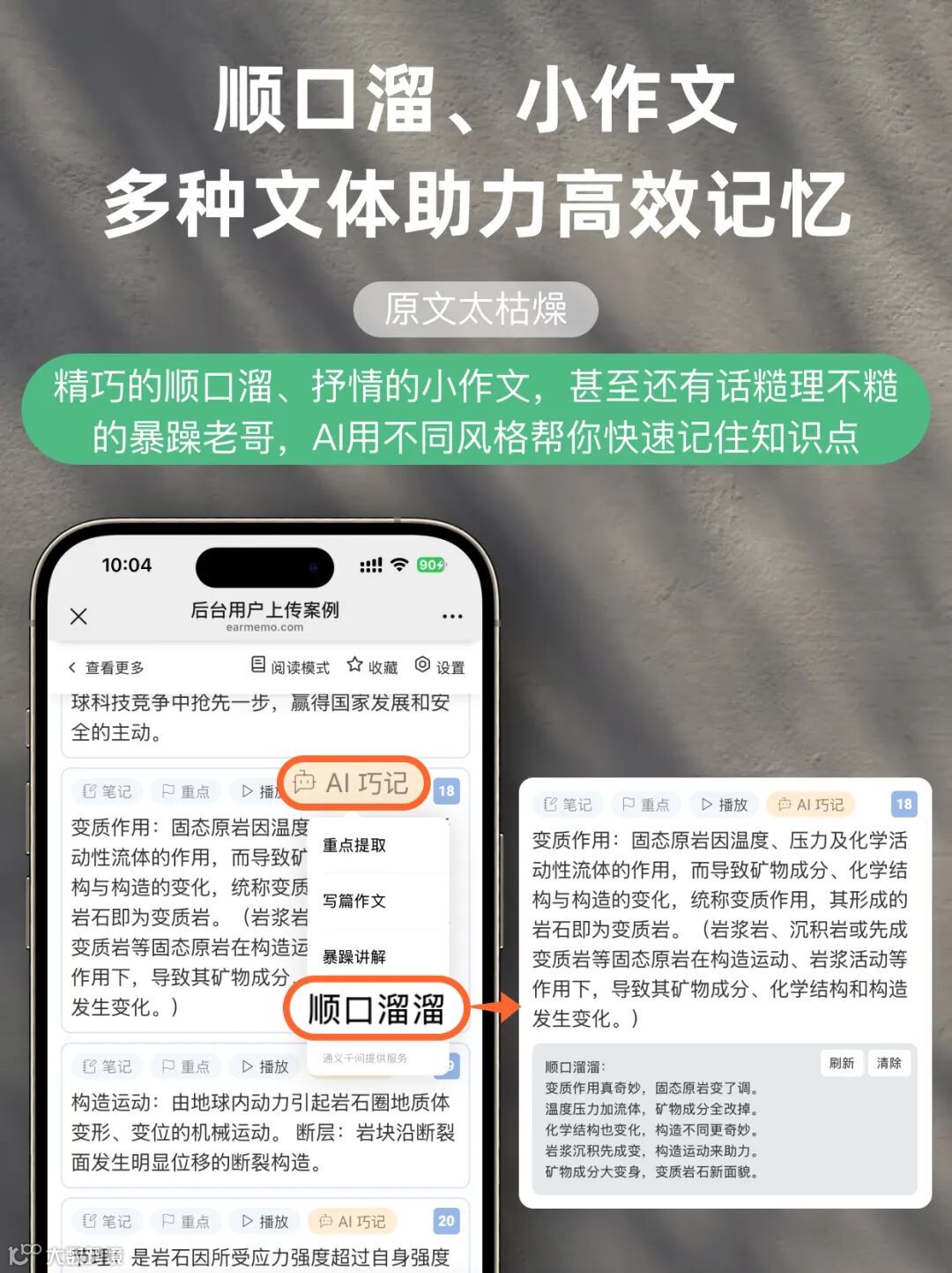 提高招生率的底层逻辑,是让潜在用户获得“肉眼可见的学习提速效果”。当同行还在用“保过班”“协议班”的老套路时,你的机构横空出世“三倍速学习套餐”,线上老师讲课,线下使用磨耳速背的AI教材陪读,用户不仅能利用碎片时间听书背书,还能选择顺口溜等有趣的AI带背风格,彻底摒弃低效枯燥的文字资料。
