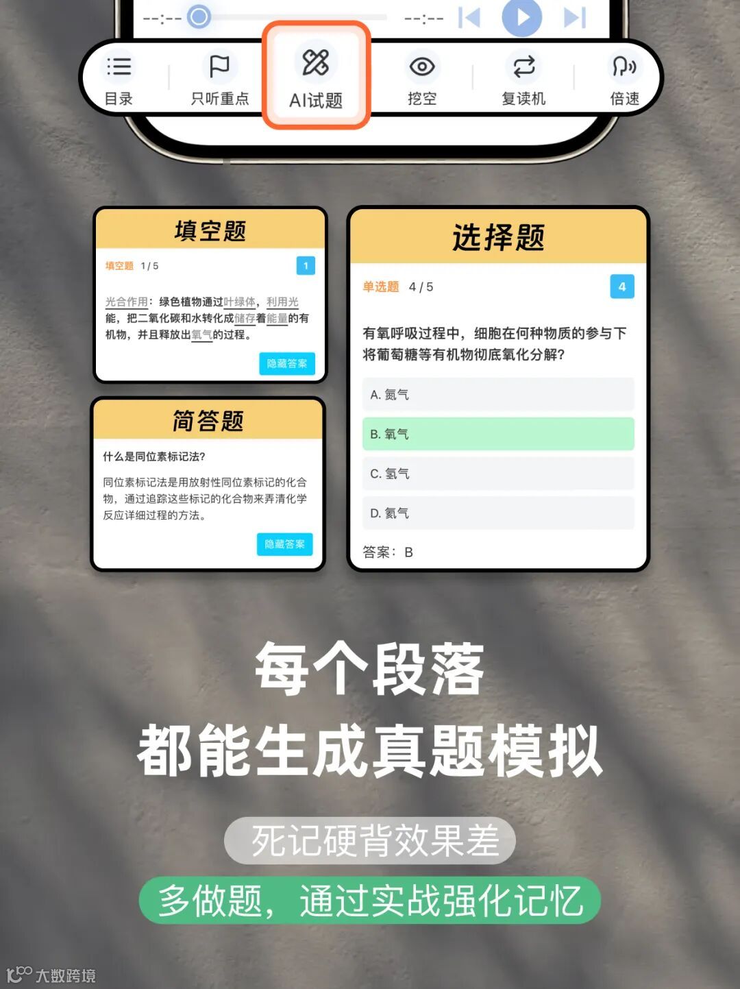 而破局之道,在于将另一种常常被忽视资源--教材,转化为具有AI功能的电子有声学习工具:通过有声朗读、段落复读、AI带背、AI出题等功能实现“听-读-练-测”的学习闭环。