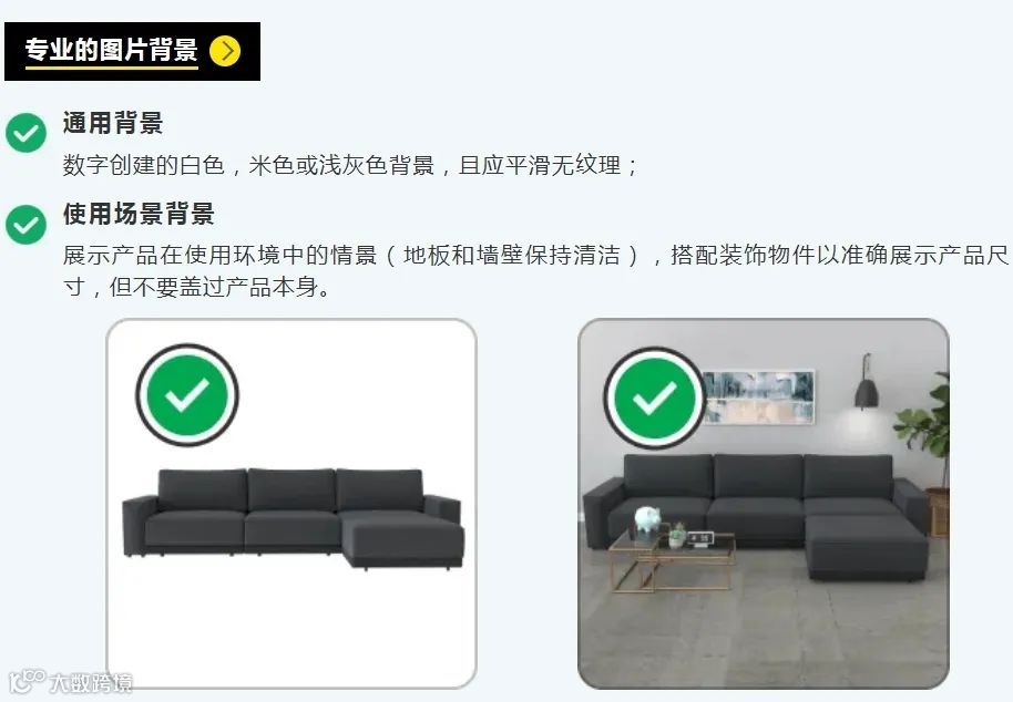 另外,家具家居品类的图片需要特别注意几个方面,以提升消费者的购物体验和促进销售。在专业的图片背景方面,通用背景为数字创建的白色,米色或浅灰色背景,且应平滑无纹理;使用场景背景为展示产品在使用环境中的情景(地板和墙壁保持清洁),搭配装饰物件以准确展示产品尺寸,但不要盖过产品本身。