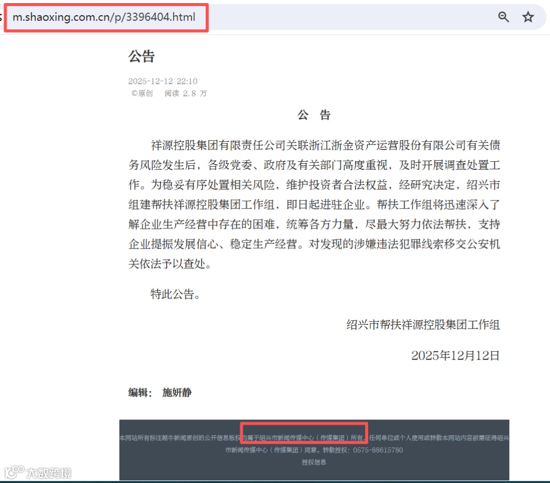 2025年12月12日深夜,绍兴市帮扶祥源控股集团工作组通过官方媒体“越牛新闻”发布公告,宣布正式进驻祥源控股,标志着这场涉及数百亿债务的金融风险事件进入政府主导的处置阶段。尽管公告未加盖公章,但其发布主体——绍兴市新闻传媒中心作为市委直属事业单位,已为公告的公信力提供了背书。