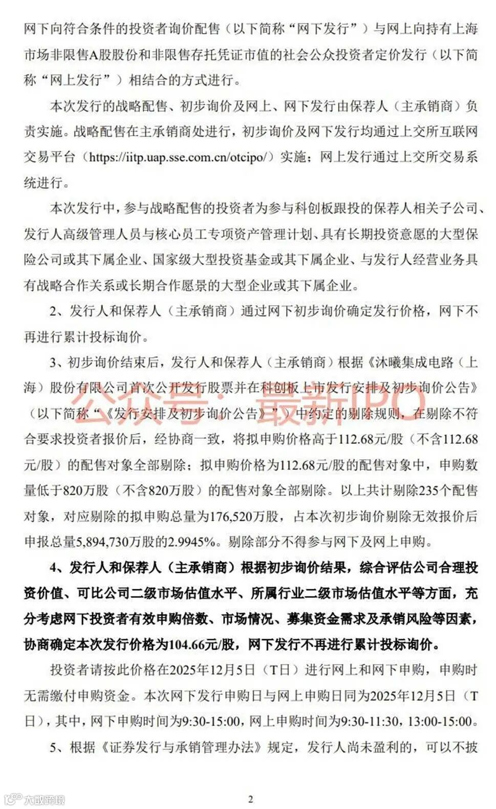 文件显示,发行人和保荐人(主承销商)根据初步询价结果,综合评估公司合理投资价值、可比公司二级市场估值水平、所属行业二级市场估值水平等方面,充分考虑网下投资者有效申购倍数、市场情况、募集资金需求及承销风险等因素,协商确定本次发行价格为104.66元/股,网下发行不再进行累计投标询价。