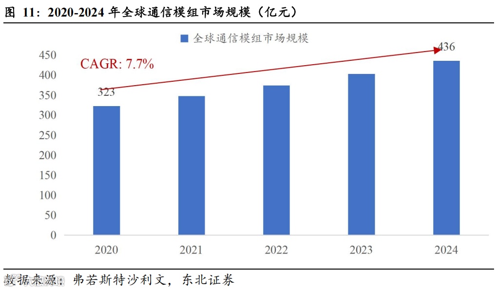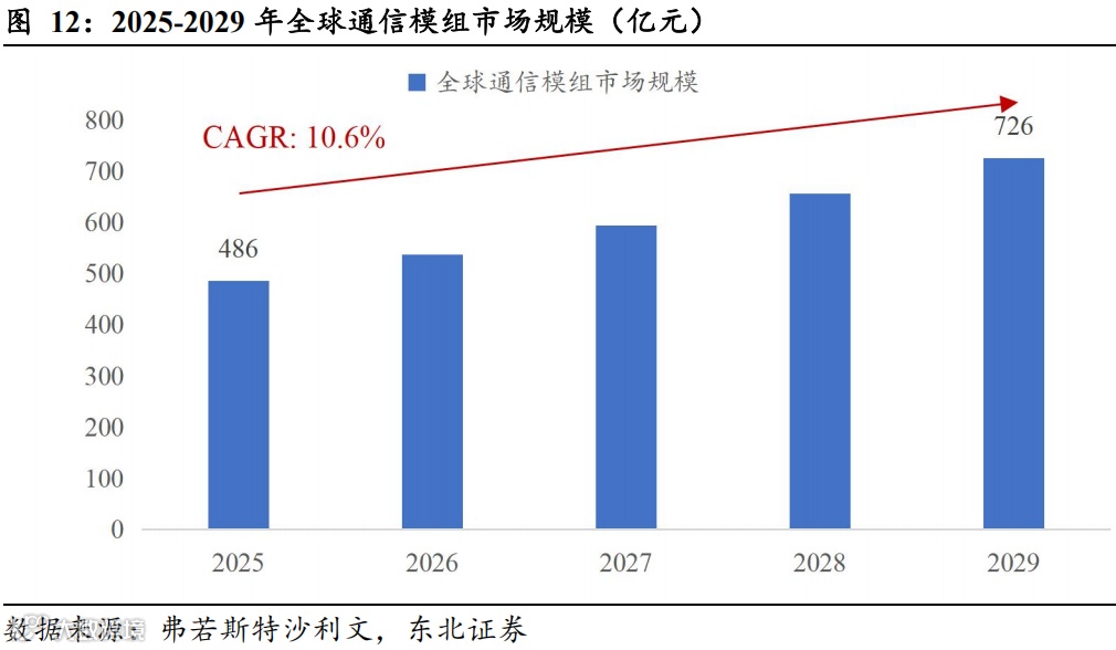 模组市场空间:伴随下游应用场景拓宽,通信模组市场规模持续增长。全球无线通信模块市场正迎来技术升级与产业变革的双重机遇。随着5G技术加速替代4G网络,通信模块作为数据传输的核心载体,市场规模呈现持续扩张态势,由2020年323亿元增长至2024年436亿元,CAGR为7.7%。其中,中国市场增速尤为显著,由2020年174亿元增长至2024年247亿元,CAGR为9.1%。另外,根据弗若斯特沙利文数据显示,预计全球通信模组市场规模将由2025年的486亿元增长至2029年的726亿元,CAGR达10.6%。这一增长主要得益于5G技术成为主流和人工智能下游场景应用激增两大核心驱动力,下游新兴应用场景包括汽车电子领域的智能化转型、智能家居生态的快速渗透。技术迭代不仅体现在通信速率的提升,更在于通信模块与人工智能、边缘计算等技术的深度融合,推动行业向智能化、集成化方向演进。