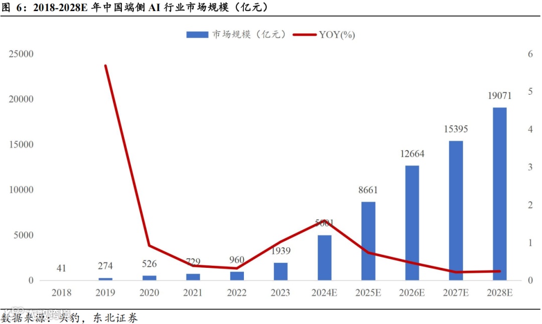 从市场规模看,中国端侧AI产业2023年规模不足2000亿元,但预计到2028年将突破1.9万亿元,2023-2028年复合增长率(CAGR)高达58%。这一增长动力主要来自三个方面: