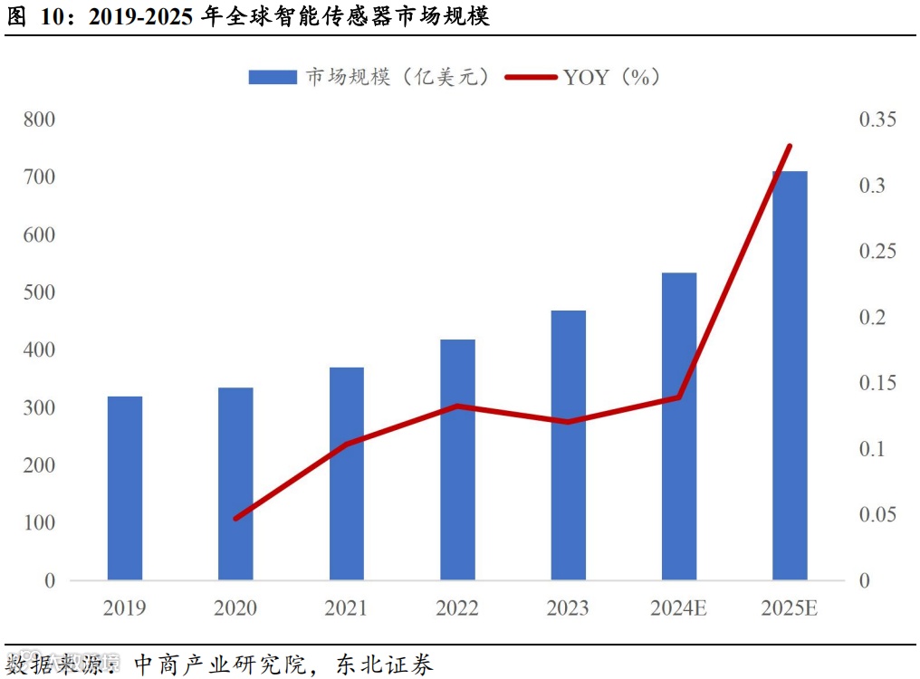 智能传感芯片/传感器市场规模:根据中商产业研究院最新发布的《2024-2029年全球及中国智能传感器市场调查与行业前景预测专题研究报告》数据显示,近年,全球智能传感器市场呈现稳健增长态势,2023年,全球市场规模达到469亿美元,2019-2023年CAGR为10.01%;预计2024、2025年该市场规模将增长至543亿、710亿美元。