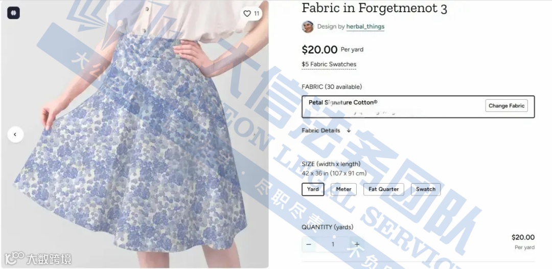 版权信息:涉案作品为蓝色碎花图案,版权登记号VA 2-446-867,于2025年2月17日完成登记。该设计受美国版权法保护,官网其余原创图案亦严禁擅自使用。