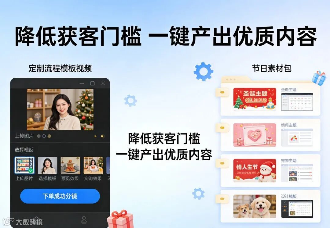 •提供“定制流程模板视频”“节日素材包”,帮助用户快速产出内容,降低获客门槛。