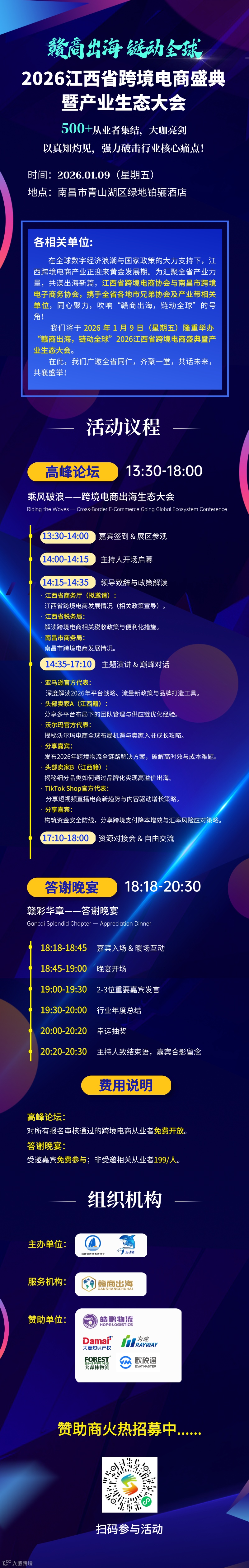 从内陆省份到出海前沿,江西跨境电商的崛起,离不开每一位赣商的并肩前行,更需要一个汇聚趋势、资源与经验的生态平台。2026年1月9日,江西跨境电商盛典及产业生态大会,邀你共赴跨境出海黄金时代,让更多优质“江西造”走向世界每一个角落!