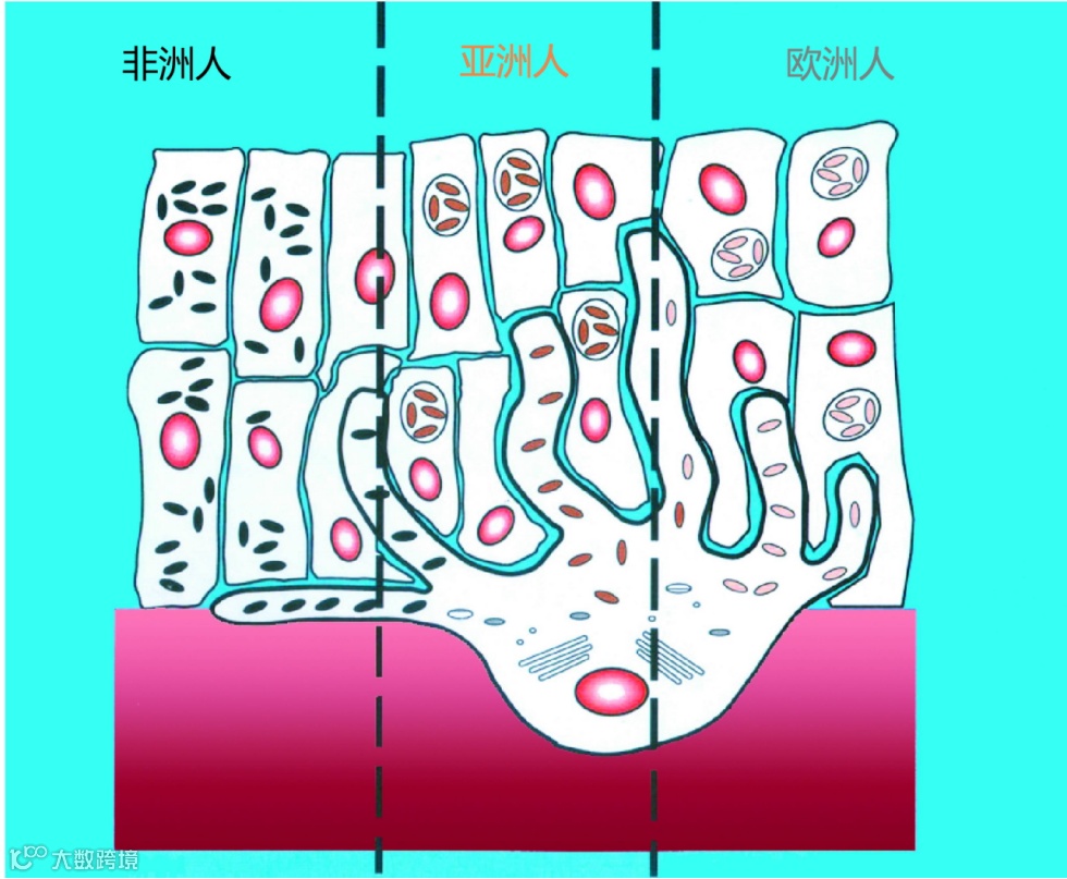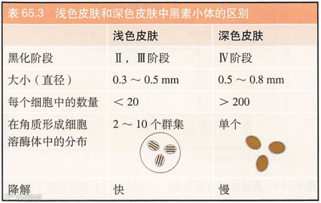 黑人皮肤中黑素细胞含有200多个直径0.5–0.8mm的黑素小体,无界膜包裹,广泛分布于表皮各层,以Ⅳ期为主;白人皮肤中黑素小体不足20个,直径0.3–0.5mm,聚集于界膜内,多为Ⅰ–Ⅲ期;亚洲人则兼具大而分散及小而聚集的黑素小体[5,6,7,8]。深色皮肤的黑素小体降解速度更慢[6]。