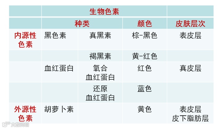 其中,黑素是决定肤色的关键色素,包括呈棕-黑色的真黑素和黄-红色的褐黑素;氧合血红蛋白呈红色,还原血红蛋白呈蓝色,二者存在于真皮血管中,血液循环状态直接影响肤色表现。胡萝卜素为外源性色素,需通过饮食摄入[2]。