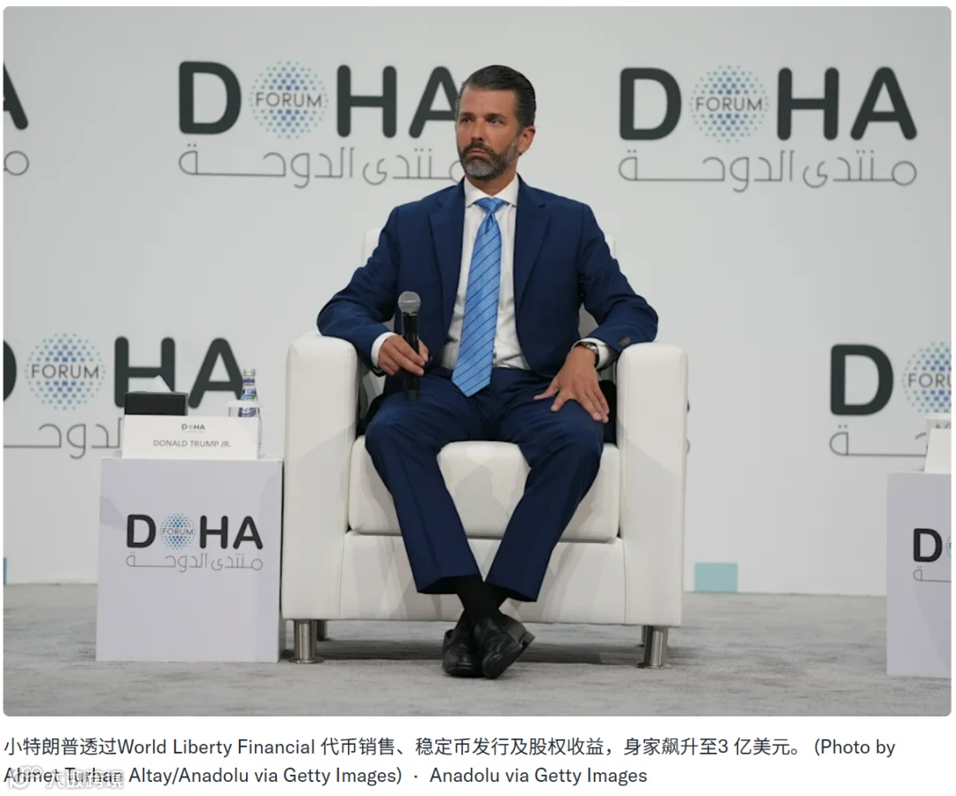 美国财经杂志《Forbes》报导,小特朗普与弟弟埃里克去年11月共同创立加密货币挖矿公司American Bitcoin,正式进军区块链领域,当时小特朗普个人财富仅5000万美元,但短短一年内透过World Liberty Financial 代币销售、稳定币发行及股权收益,身家飙升至3亿美元,其中World Liberty Financial 作为核心平台,已售出价值14亿美元的代币,特朗普家族分得52%收益,光是小特朗普个人就获得8000万美元左右的现金。
