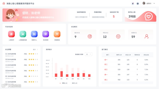 海棠心智情绪筛查系统配备专业的可视化监测预警平台,具有以下核心功能:
