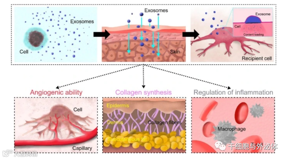 研究表明,外泌体具备三大核心功能:促进血管生成、刺激胶原蛋白合成及调节炎症反应,有助于克服传统皮肤治疗手段的局限性。