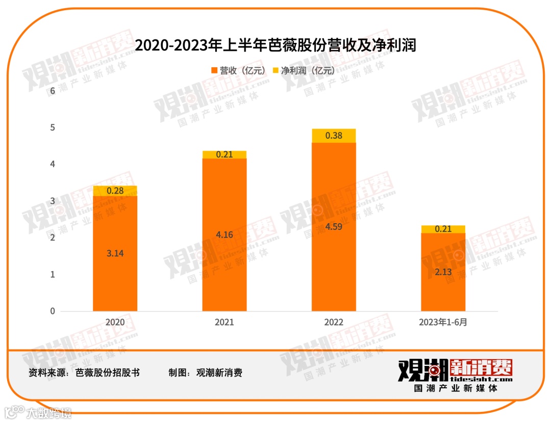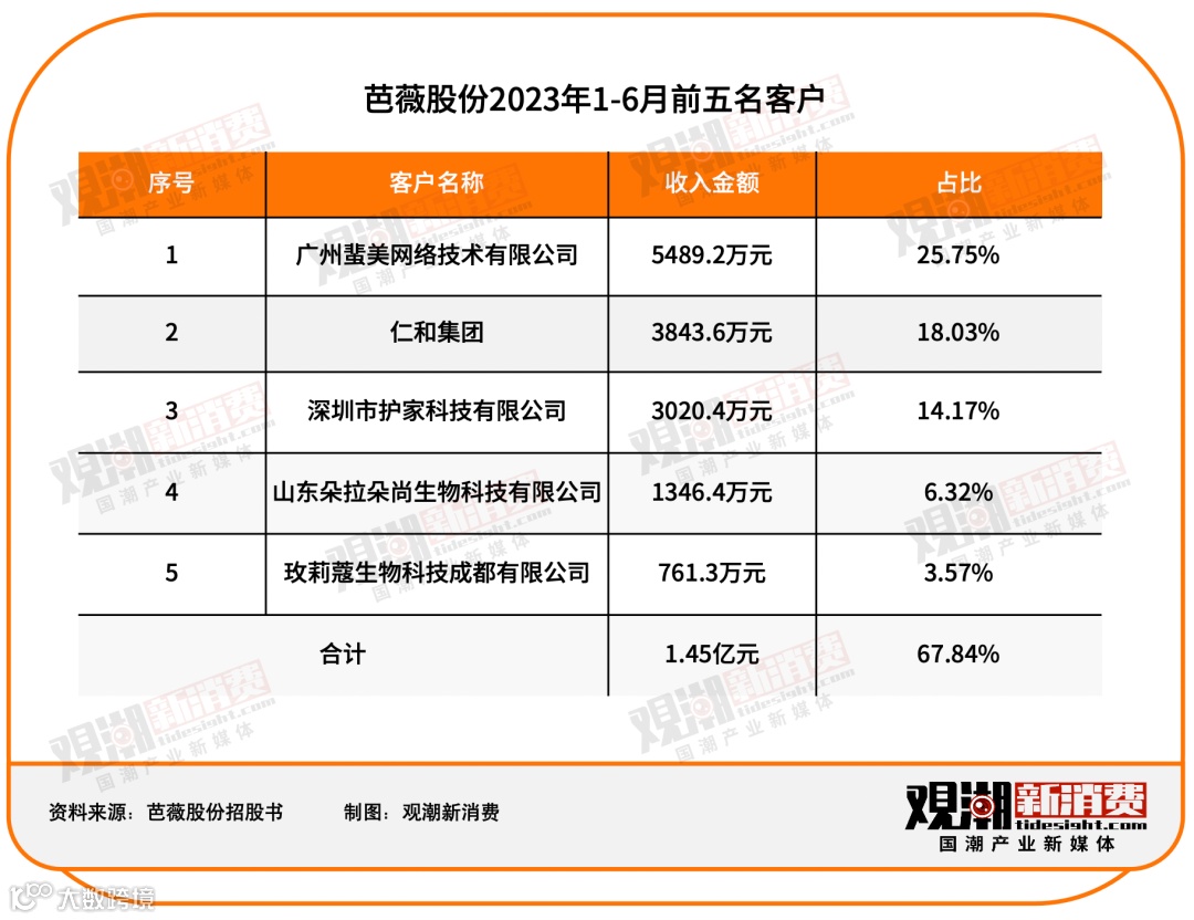 成立于2006年的芭薇股份,是一家集产品策划、配方研发、生产制造、功效检测于一体的品牌服务商,2023年上半年实现营收2.13亿元,净利润0.21亿元。其客户涵盖联合利华、丸美、仁和匠心、HBN等知名品牌,2023年上半年前五大客户贡献收入1.45亿元,其中蜚美(Feime)占比近三成,约5489万元。