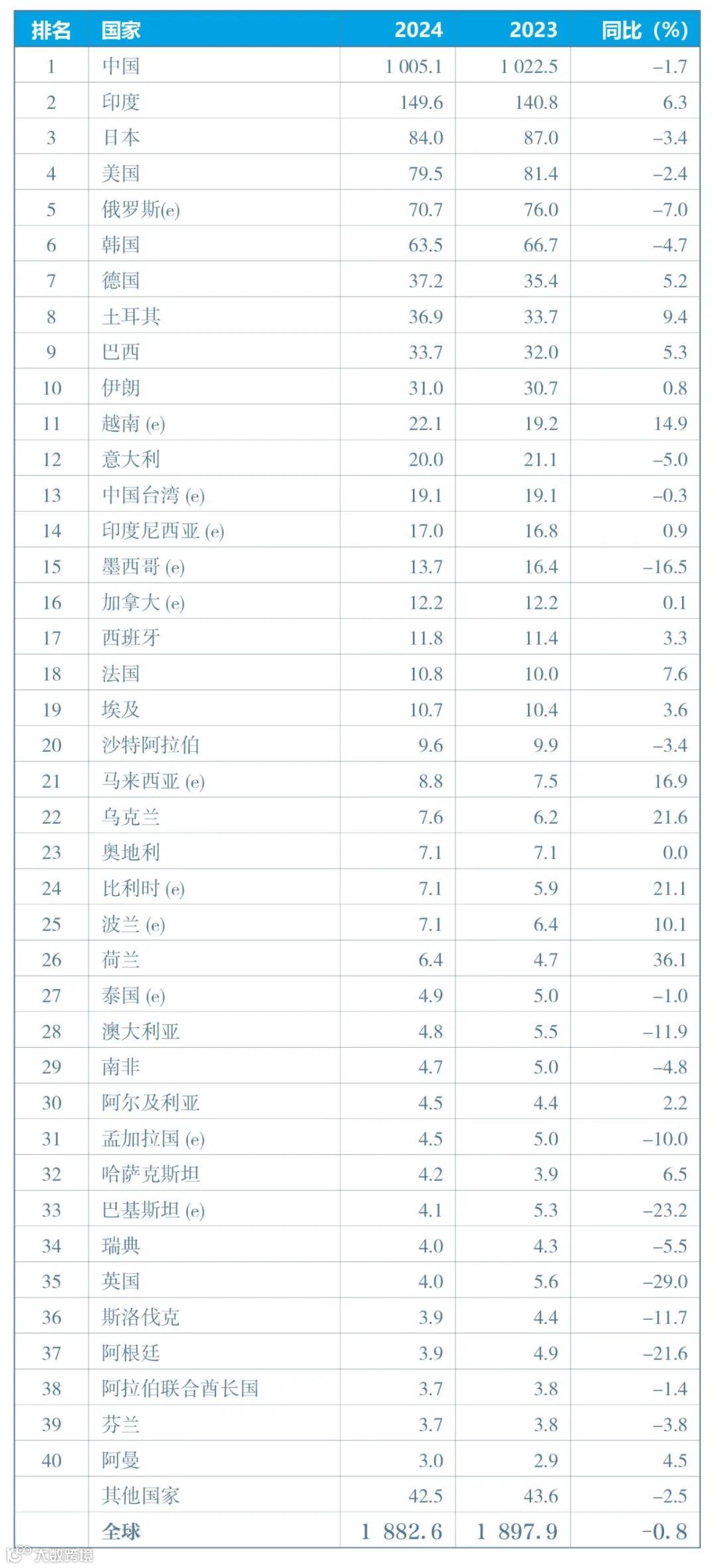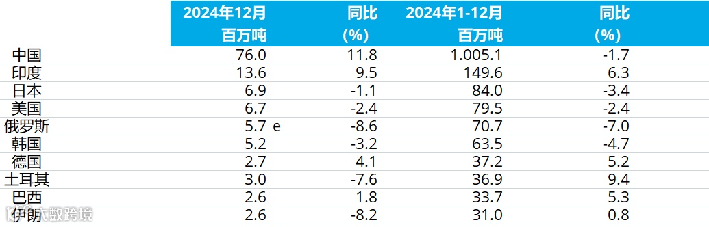 中国产量7597万吨,同比增长11.8%;印度1360万吨,同比增长9.5%;日本690万吨,同比下降1.1%;美国670万吨,同比下降2.4%;俄罗斯预估570万吨,同比下降8.6%;韩国520万吨,同比下降3.2%;德国270万吨,同比增长4.1%;土耳其300万吨,同比下降7.6%;巴西260万吨,同比增长1.8%;伊朗260万吨,同比下降8.2%。