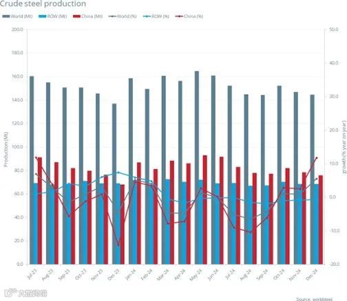 2024年12月,全球71个纳入世界钢铁协会统计的国家和地区粗钢产量达1.445亿吨,同比增长5.6%。2024年全年,全球粗钢总产量为18.826亿吨,同比下降0.8%。