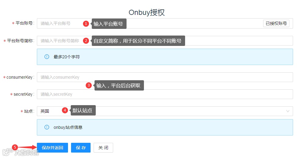 3. 填写信息:设置账号名称,输入consumerKey和secretKey,站点默认为英国站,完成后点击“保存并返回”。
