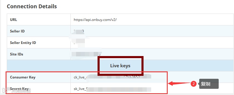 登录OnBuy平台后台,进入“Live Keys”页面,复制consumerKey(消费者Key)和secretKey(秘钥Key)。