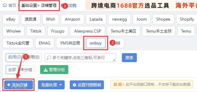 2. 添加店铺:进入“基础设置—店铺管理—OnBuy”,点击“添加店铺”。