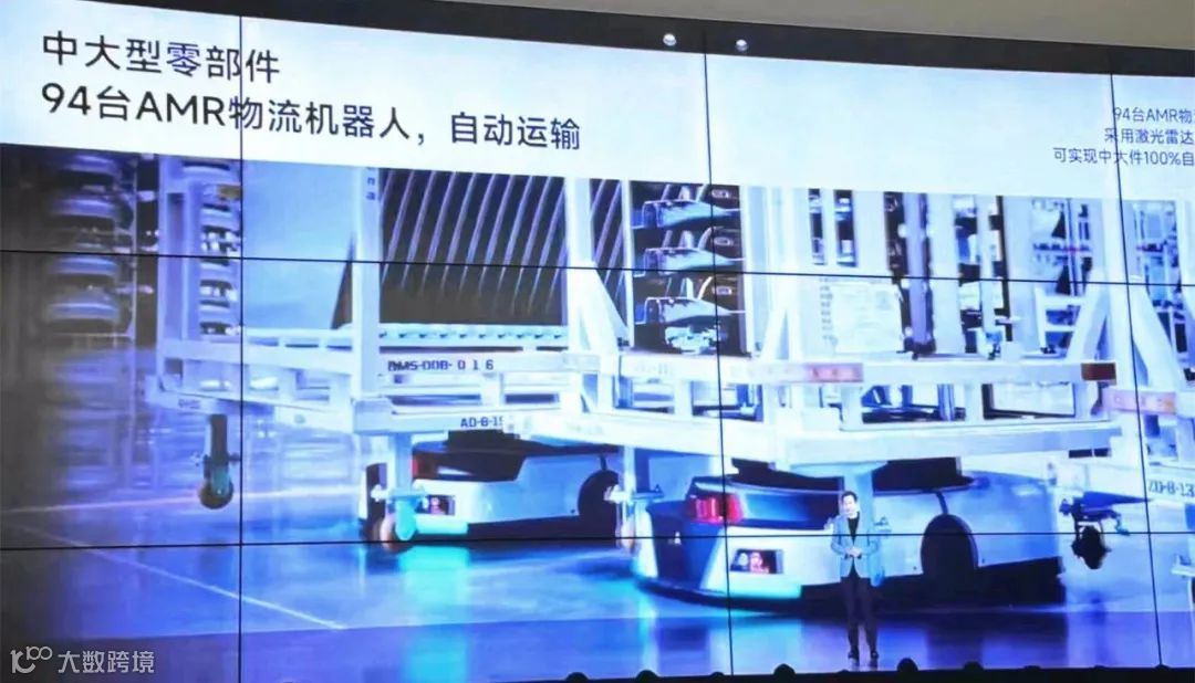 SU7上市发布会曝光的小米汽车工厂,其整个车间使用了94台AMR物流机器人,实现中大型零部件的自动化运输。