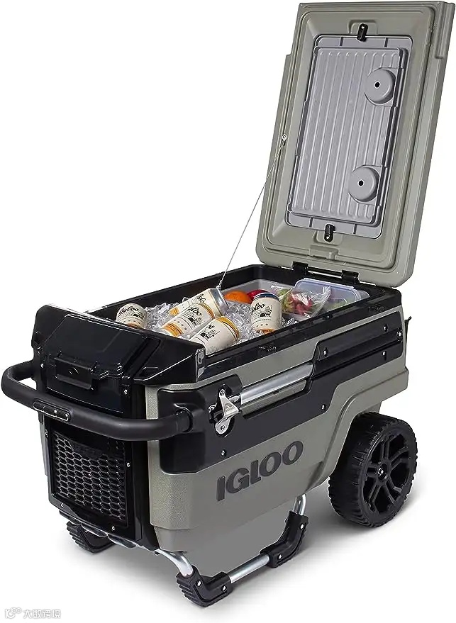 考虑到特殊的地面情况,一款带轮子的小冰箱应该是最适合沙滩的冰镇设备。大直径的滚轮使得沙滩拖行变得毫不费力,想象一下从停车场到沙滩,背着或者提着十几瓶饮料加冰块走十来分钟,谁都更愿意使用小拖车。除此之外,这款拖车顶部还设有4个杯孔,可以当作托盘使用。
