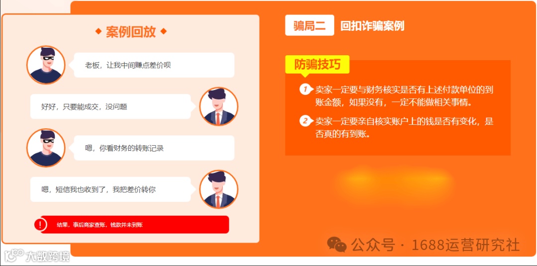 ④ 回扣欺诈:假买家虚假转账后诱导商家退回扣;