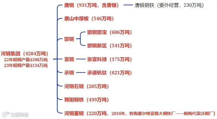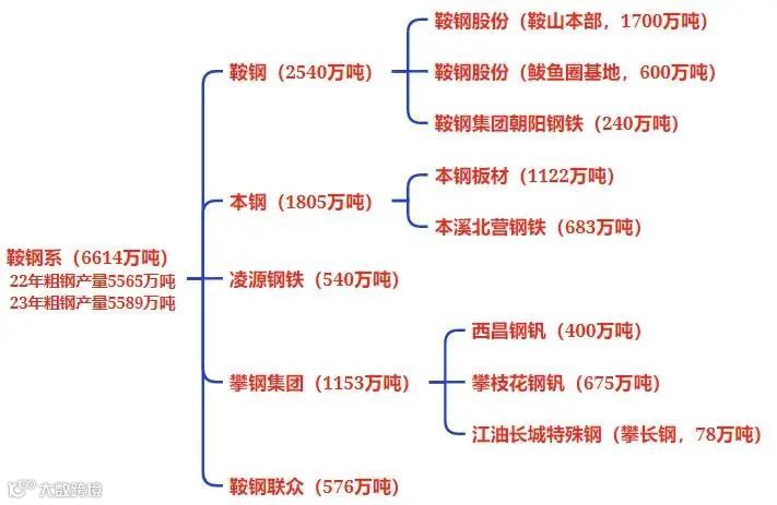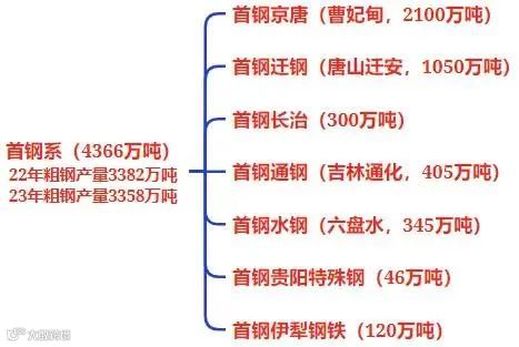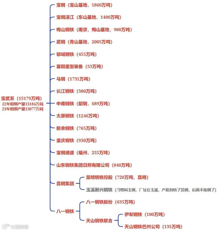 其他主要国央企包括:华菱系2711万吨、中信系2576万吨(含南京钢铁)、柳钢集团1835万吨、河南钢铁集团1670万吨(其中安阳钢铁900万吨为国有控股)、山东钢铁集团1640万吨(莱钢1000万吨为控股)、包钢1200万吨、三钢集团1123万吨、酒钢集团1105万吨、陕钢集团1010万吨、杭钢集团570万吨、新兴际华540万吨等。