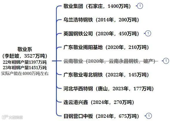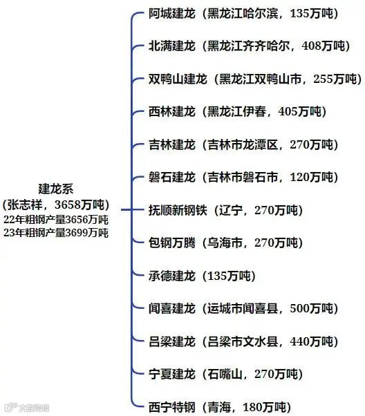 其他主要福建系企业包括:亚新系1076万吨、桂鑫系1013万吨、四川冶控集团1000万吨、江苏沿海钢铁集团920万吨、晋钢集团700万吨、玉昆钢铁685万吨、三宝集团600万吨、中新钢铁560万吨、兴华财富集团542万吨、呈钢集团515万吨等。