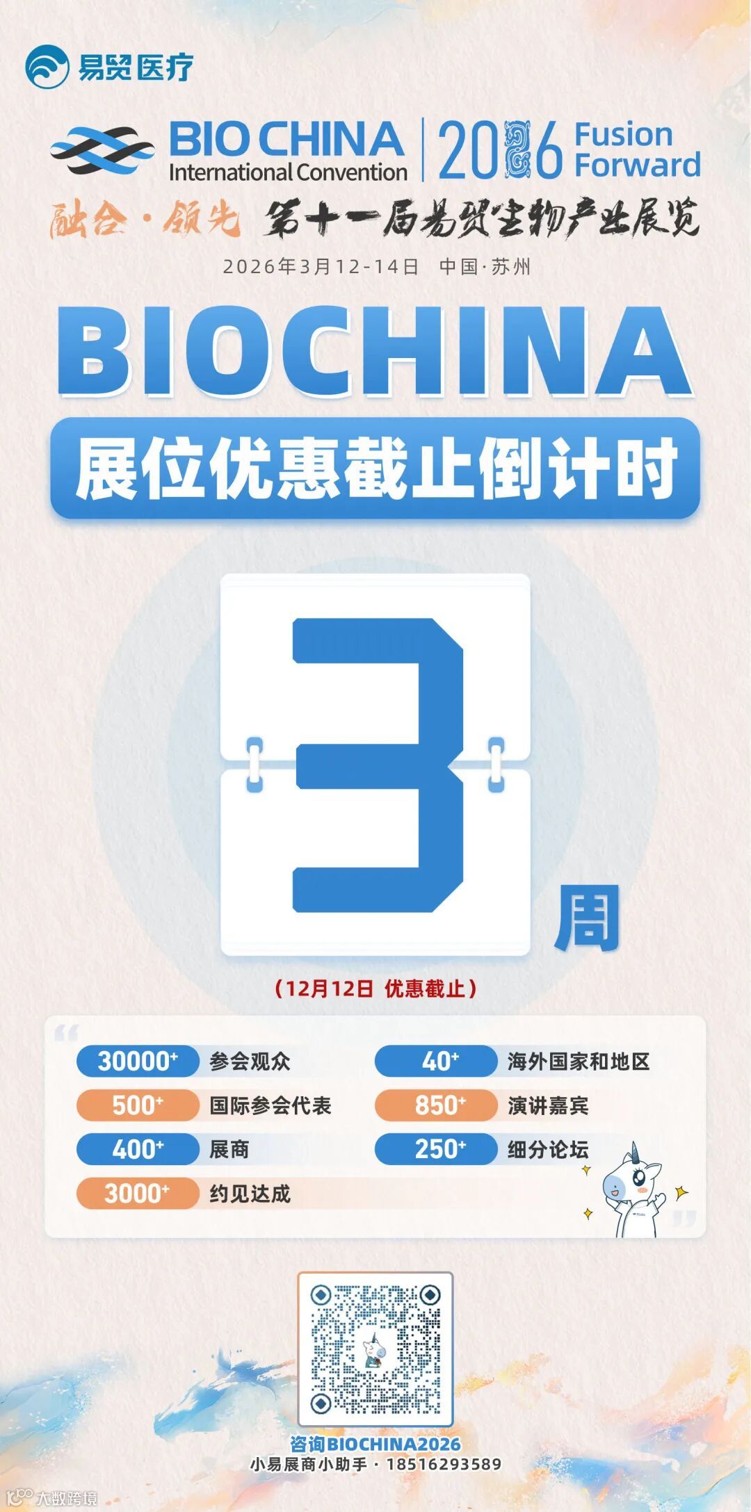 BIOCHINA2026(第十一届)易贸生物产业展览将于3月12-14日在苏州举行,本届大会以 “融合·领先” 为主题,计划设实验室仪器馆、制药装备馆,原料试剂馆、国际服务馆、耗材馆,综合馆,旨在打造一个全产业链汇聚、引领未来的顶级行业盛会。