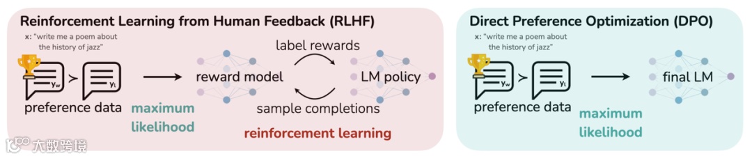 对齐的挑战与替代方案:RLHF过程复杂且高度依赖昂贵的人类标注数据 。因此,研究人员也在探索更高效的替代方案,如直接偏好优化(Direct Preference Optimization, DPO),它通过一种更直接的方式利用偏好数据来调整模型,过程更稳定且计算成本更低。