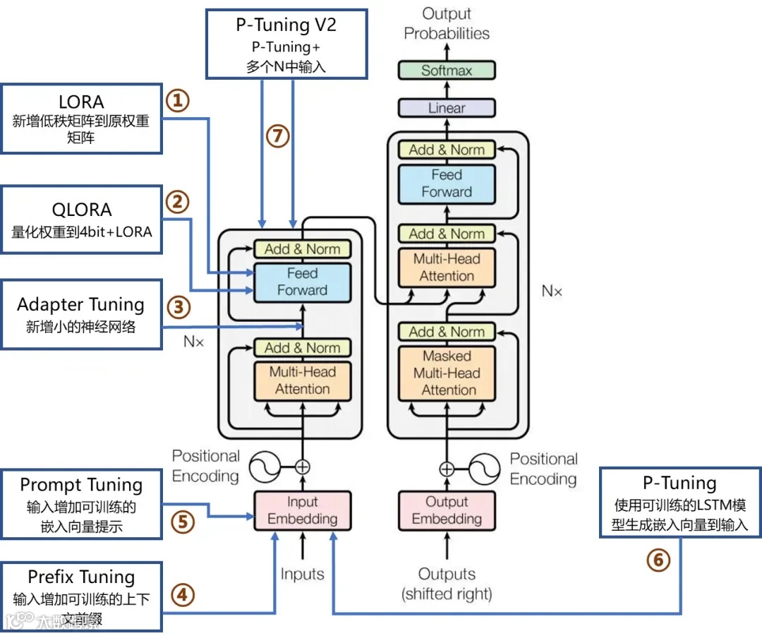 基于低秩矩阵分解的微调:如LoRA、LoHa、AdaLoRA等,通过分解权重矩阵减少需要更新的参数量,大幅降低计算需求。