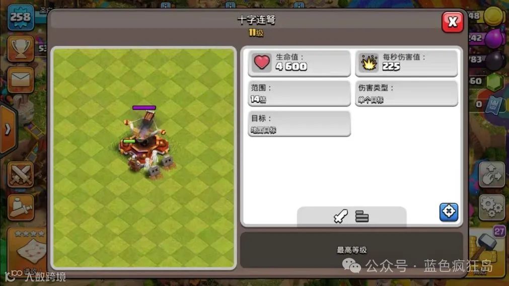 此外,《部落冲突》十字连弩可在“陆空兼顾”与“地面攻击”模式间切换,前者功能全面但射程较短(11.5格),后者专精地面且射程更远(14格)。